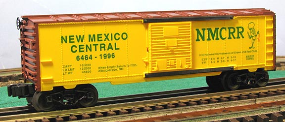 New Mexico Central 6464 type boxcar built by Lionel in 1996 for the TTOS in New Mexico for that year. Uncataloged. FEATURES: Has yellow body, green lettering, and brown roof and ends. die-cast metal sprung trucks * operating couplers * opening cargo doors * authentic New Mexico graphics featuring chili man holding the peppers