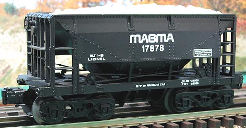 | Tough car with classic MAGMA graphics, premier ore car roadname. Built in 89 and uncataloged for the TTOM (Toy Train Operators Museum). FEATURES: operating couplers * removable ore load * Symington-wayne trucks, and authentic MAGMA paint scheme and graphics. This is one of the more sought after ore carriers Lionel produced. |