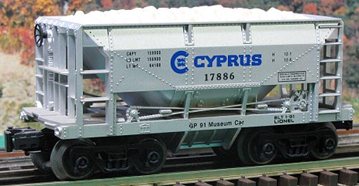 | Uncataloged, and produced by Lionel in 1991 for the Gadsen-Pacific Toy Train Operating Museum in Tucson, Arizona. GPD is a charitable, non-profit corporation dedicated to the advancement of model railroading by the collection and operation of toy trains and railroad memorabilia, as well as preserving prototype railroad history by sponsoring railroading related activities and events. This car is part of a continuing series of ore by Lionel(beginning in 1989), used as a fund raiser. Production is very low, usually in the 300 range. The cars always celebrate a mining company in Arizona. Features; plastic molded body, removable ore load, plastic trucks with operating couplers, and authentic Cyprus Ore Company paint scheme and graphics. |