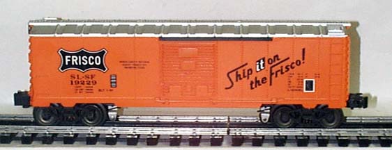 | Produced by Lionel in 1991, part of the Frisco Fallen Flag set #5. This brightly colored Frisco box car exterior hides the railssounds equipment inside. Great way to add railsounds to any traditional diesel locomotive. Plastic molded 6464 stlye body, metal frame, die-cast sprung metal trucks, Volume control, authentic Frisco paint scheme and graphios. 9 volt battery not included. |