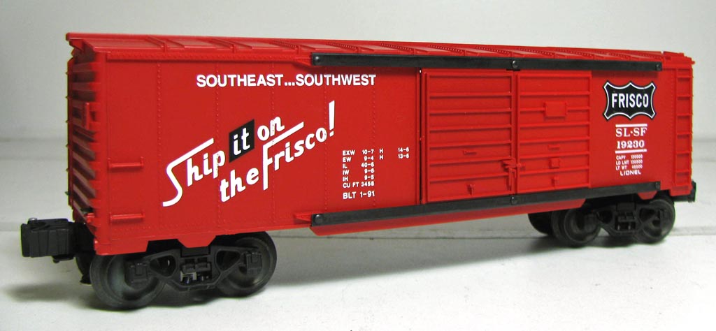 | Offered by Lionel in 1991 as part of their double door boxcar fleet and the special Lionel Fallen Flags set #5. FEATURES: operating couplers * metal chassis * opening cargo doors * metal door guides * brake wheel * die-cast sprung trucks * authentic FRISCO graphics plus official company logo on car sides. |