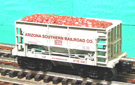 | Uncataloged and produced by Lionel in 1999 for the Toy Train Operating Museum(TTOM). These were in extremely small quanties(around 200). TTOM always showcaes a very small western road name. Features; plastic molded body, plastic trucks with operating couplers, and authentic Arizona Southern RR paint scheme and graphics. |