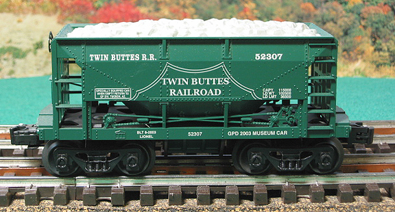 | Uncataloged and produced by Lionel in 2003 for the Gadsden-Pacific division of TTOS, in conjunction with the Toy Train Operating Museum in Tucson, Arizona(TTOM). These ore cars have been made continuously every year since 1988. Features; plastic molded ore car body, platic trucks with operating couplers, removable ore load, and authentic Twin Buttes RR paint scheme and graphics. Production run of under 500 units. |