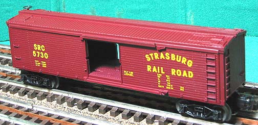 | Produced by lionel in 1985-86, wood-sided reefer; tuscan body; yellow-gold lettering and numbering; top brakewheel; plastic arch bar trucks; "BLT 1-85". Popular in the Eastern Pennsylvania area because of association with the Strasburg Tourist Railroad. Not only do they have a working railroad, they built one of the largest Railroad museums in the country. Look it up! |