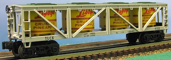 | Produced in 1975(available for separate sale, and also came in the MR F-3 Service Station set, 6- 1579). Has become very popular because it goes along with Lionel's billboard reefer series. Features; plastic molded body with four Libby's crushed pineapple vat car, plastic Symington Wayne trucks with operating couplers, and authentic Libby's graphics. |