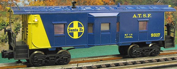 | Produced by Lionel in 1979 rendered in their famous yellow/blue freight color scheme. This was a first for Lionel. FEATURES: operating couplers * die-cast trucks * lighted interior * lighted red marker lanterns on rear * metal ladders/brake wheel * metal chassis * smoke stack * authentic Santa Fe color graphics typical of their freight livery status (yellow/blue) plus official company logo on caboose sides |