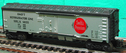 This was one of the first MPC/Lionel billboard reefers built in 1973. FEATURES: silver painted body and doors, black roof and car ends, black lettering. FEATURES: Symington-Wayne trucks * operating couplers * opening cargo doors * detailed reefer undercarriage * authentic Swift graphics and official Company logo.