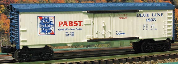 | Produced by Lionel in 1974-75, and was part of the MPC Billboard Reefer series in the 70's. Have become very popular due to the fact Lionel will never catalog an alcohol and cigarette series again. White body and door, medium blue roof, blue and red lettering, Symington Wayne trucks, and authentic Pabst 70's logo. |