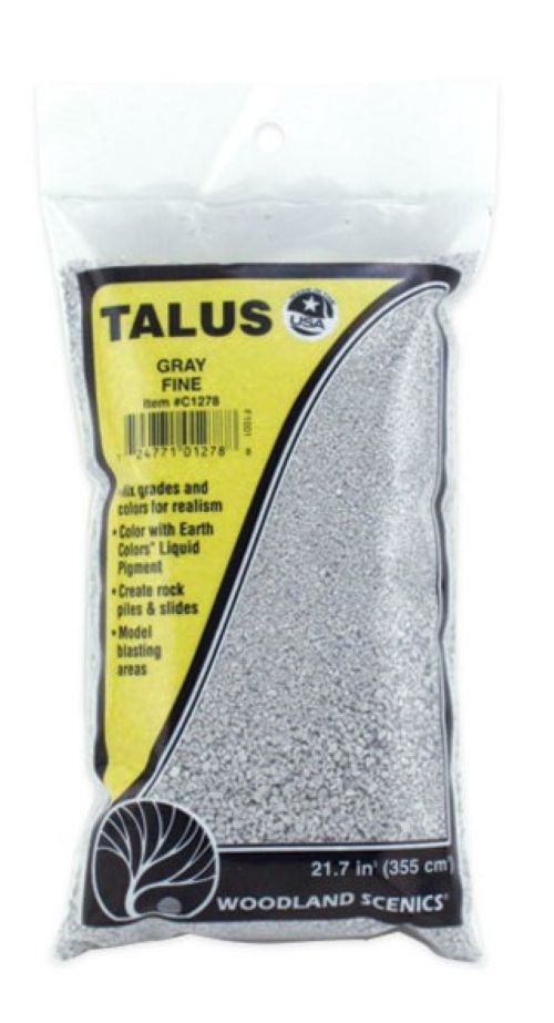 | Use model talus (rock debris) wherever you create rock faces, outcroppings and/or road cuts. Sprinkle talus and secure with a 50/50 mix of water and scenic glue. Intermix grades and blend shades for the most realism! Woodland Scenics number C1278. |