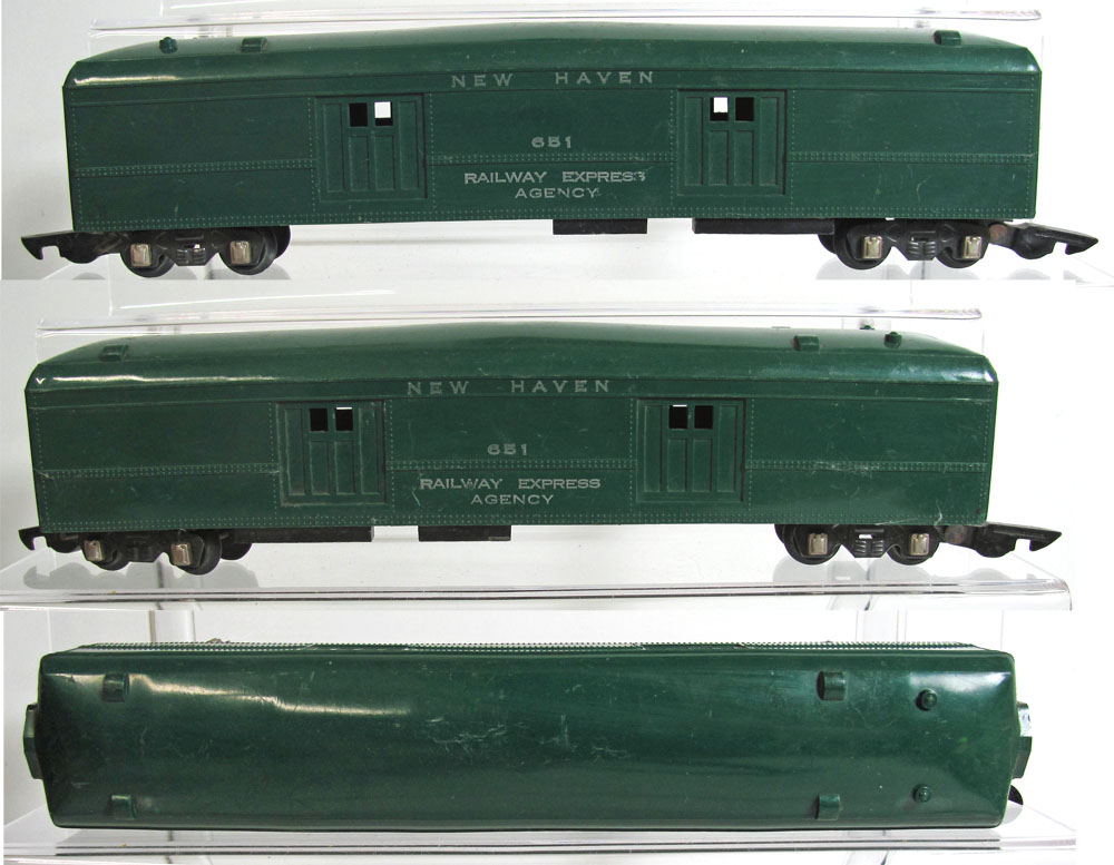 Produced from 1946 until 1953, the 651 baggage car was the companion to the 650 coach as well as the 652, 653 and 654 heavyweight cars. The car experienced a long run encompassing at least twelve variations. Some of the major variations were red bodies verses green bodies, plastic, diecast or sheet metal bases, and painted or non-painted bodies. This car never came lighted and featured tinplate trucks with either weighted or non-weighted link couplers. Marked on each side in white lettering was "NEW HAVEN" and "RAILWAY EXPRESS AGENCY" along with the number 651 - all positioned between the two doors. This example is in Excellent (C7) condition as shown, and is the early plastic-based version from 1946