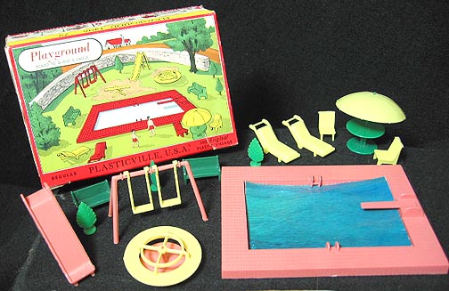 | Introduced in 1957 in a very ornate one-piece lid style box. There are two color combinations to this item: yellow or salmon. Complete kit contains 15 pieces with pool, swing set, benches, slide, bushes, chairs, table and umbrella (table tip is usually broken). Very tough piece to find complete. |