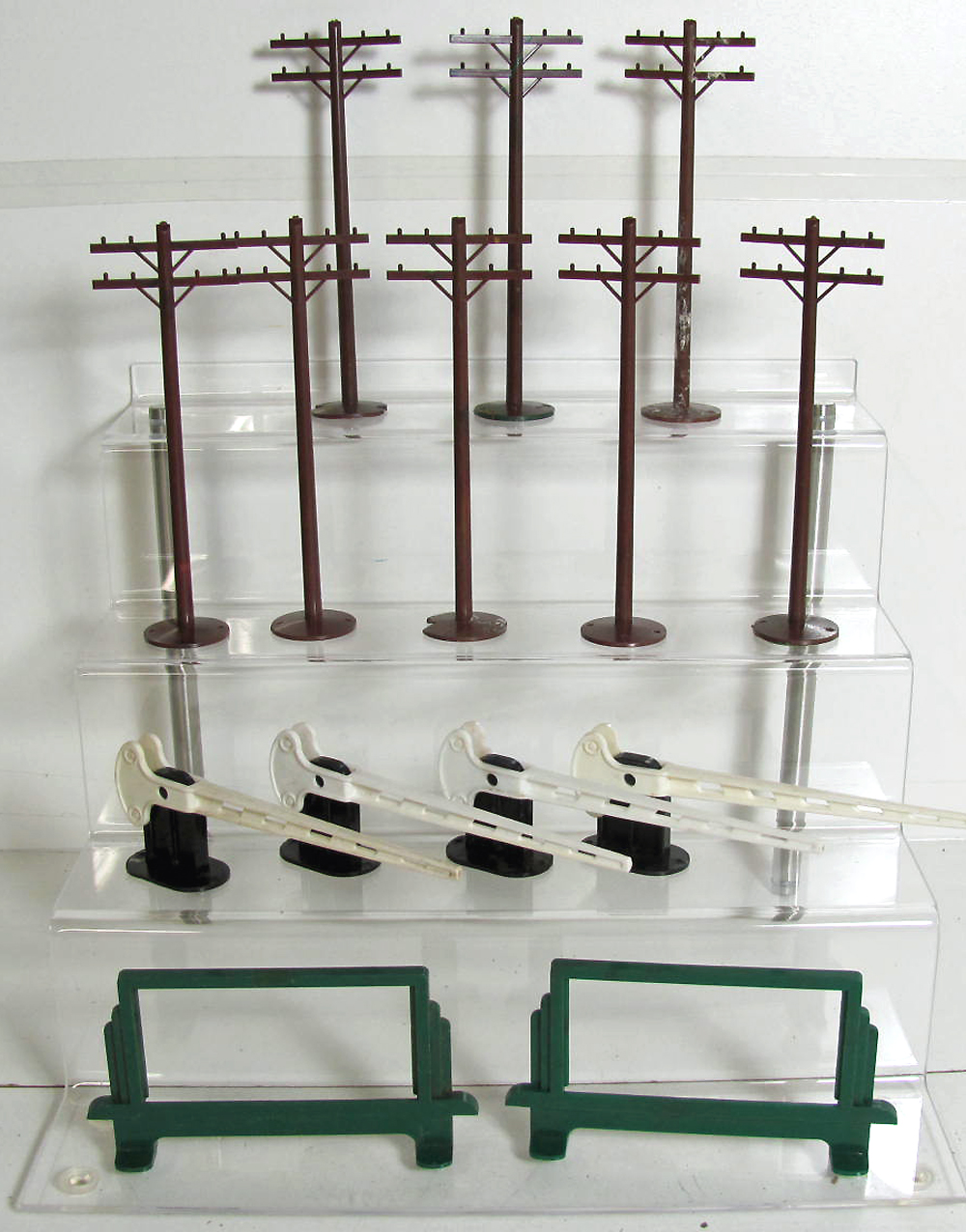 This collection of vintage Plasticville consists of roadside accessories to decorate the crossroads of your layout! Contains eight utility poles, two green billboard frames ready to be customized, and four crossing gates. Need a little clean to get them in pristine condition!