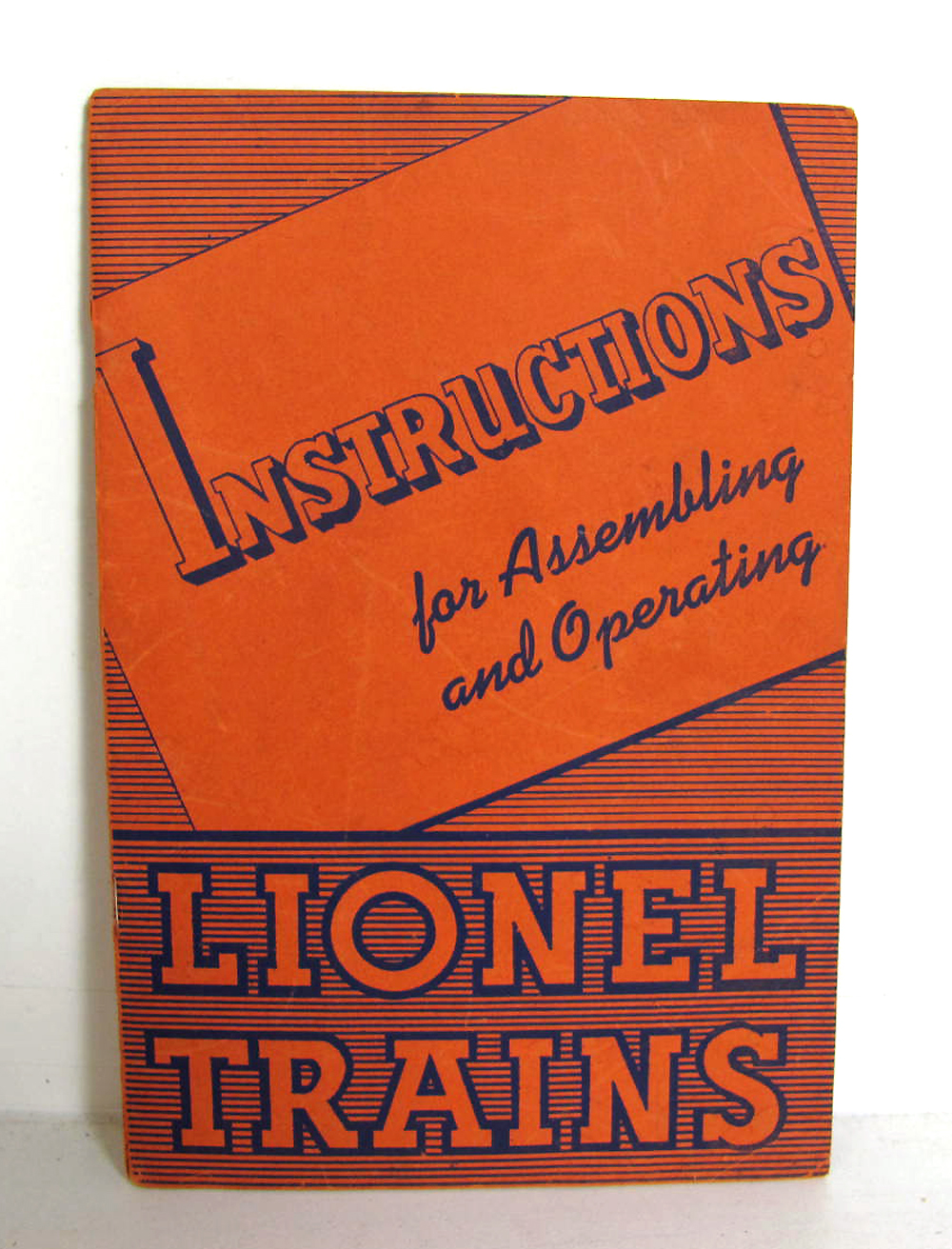 Booklet accompanied sets in 1940. Orange thick paper stock cover with navy blue printing on front. 40 pages. This orange version was actually reprinted by Lionel in this color in 1941 - the color of the 1940 cover is beige. |