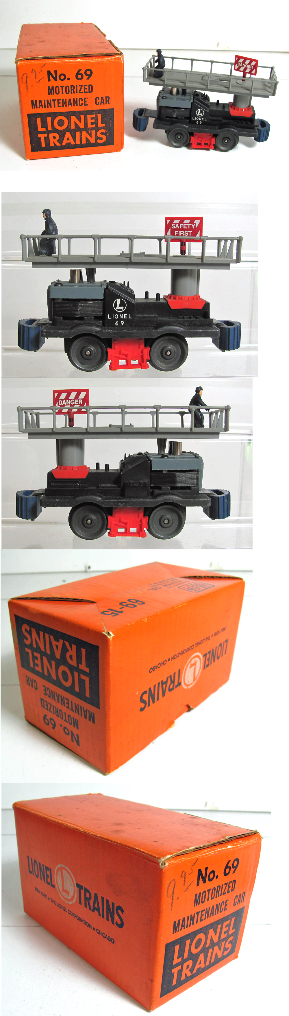 | This is one of the toughest motorized unit to find complete, unbroken and in Like New conditionUsually, the original red sign and man are missing, and the platform fence is broken (if not completely missing)The little man and rotating sign are ORIGINAL!Self-powered, it does not need a loco to get to the work site!Did you ask "what in the world were these were used for on real railroads?" (especially because the platform doesn't rotate and workers cannot reach the trackside signals!). Well, the Lackawanna had a couple of these so the workers could reach the overhead catenary wire on their electified lines out of Hoboken to Montclair, Gladstone and Dover. The Pennsy and New Haven also had them here in the EastOriginal box is complete. |