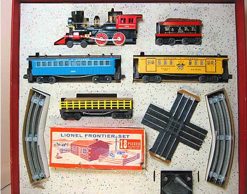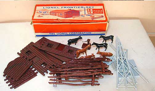 The set contained a unique 963 frontier set box with cabin, fence, windmill, pump, horses and cows. The box in this set differed from standard 963 frontier sets with a "Frontier" scene printed on the front of the box and with a unique number 963-100 versus the standard 963 number found on other frontier sets. The set box was a large maroon flat box without a lid containing a die-cut filler with red and green sparkles that fit into a plain cardboard sleeve. |