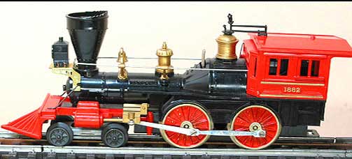 The 1882 locomotive and 1882T tender were black and orange plastic with gold heat stamped lettering. The locomotive was equipped with a light but not smoke. |