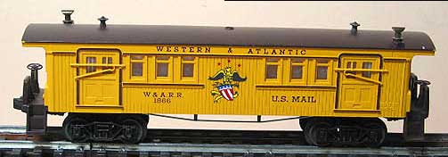 The 1866 mail car was a standard production yellow body with brown roof version car that was standard in 1862 027 sets. | ||||||||||||||||||||
