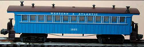 The blue 1885 passenger car was unique to this set. It had a brown roof and white heat stamped lettering. | ||||||||||||||||||||