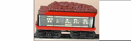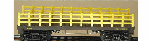The 1887 flat car with yellow fence was also unique to this set. It had yellow heat stamped lettering. | ||||||||||||||||||||