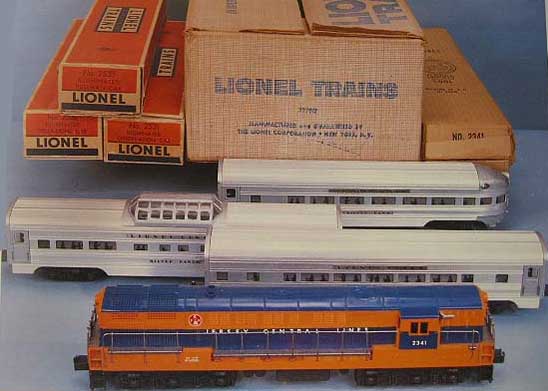 This is the Rare 1956 Jerey Central 2341 FM passenger set with "flat channel" type passeger cars. This is a premier post-war Lionel set. It includes the rare 2341 FM Jersey central and 3 aluminum passenger cars.