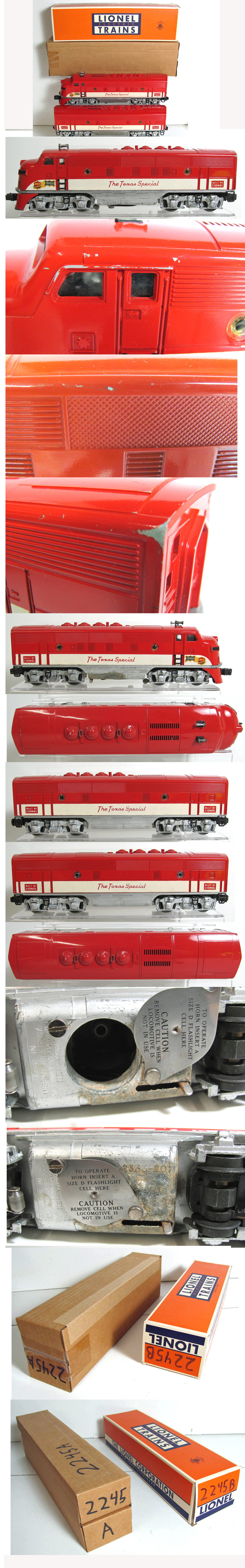 Please note we did not assign an official grade on this Texas Special. The corrosion on the exterior of the "fuel" tank (which does not extend to the interior) confuses matters, and we have to let you decide what grade appliesThe bodies on this Texas Special look great with brillant paintThe powered unit has marks on the edge of the roof - one over the engineers cab and one above the rear ladder, rub marks along the back of the roof rectangle, box rub on one exhaust port, and one rib in the louvers is broken. Also note the rub mark on the bottom of the red pilotWe have shown these in highly magnified photo's so you can see exactly what you are getting, but please note they are much less visible and not readily conspicious without magnfication If there was no corrosion, we would grade the loco/body a very strong Excellent if not' Like New with exceptions' because of the overall spectacular appearanceThe loco has not been run very muchBuilt with unbeatable Lionel Post-War quality, this loco continues to be a spectacular looking addition to any layout or collection It will run for many years of faithful service, and is fully guaranteed with all of Lionel's best Post-War features (Magnetraction, Pullmor motor, horn, operating couplers, headlight and heavy all-metal diecast base)Reproduction boxes are including. |