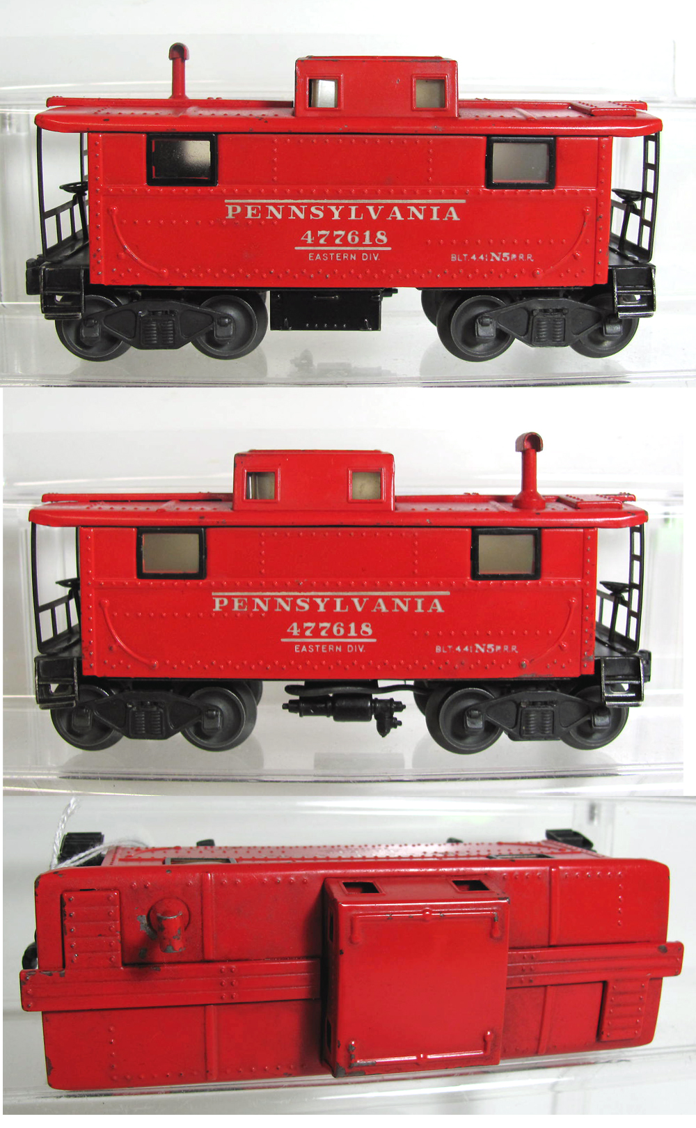 | Here's a great all-metal caboose produced in 1947, representing Lionel's attempt at using metal for more realistic/scale looking equipment than prior tinplateThis was the last all-metal caboose produced in the Post-War eraGraded Excellent. Please note there is surface roughness on the roof but paint and appearance is great!This one is the "Type 4" per the Doyle reference guides; with "Eastern Division" under the number "4776218" and black window frames, lighted interior, operating coupler (which is the flying vector board original coil coupler). |